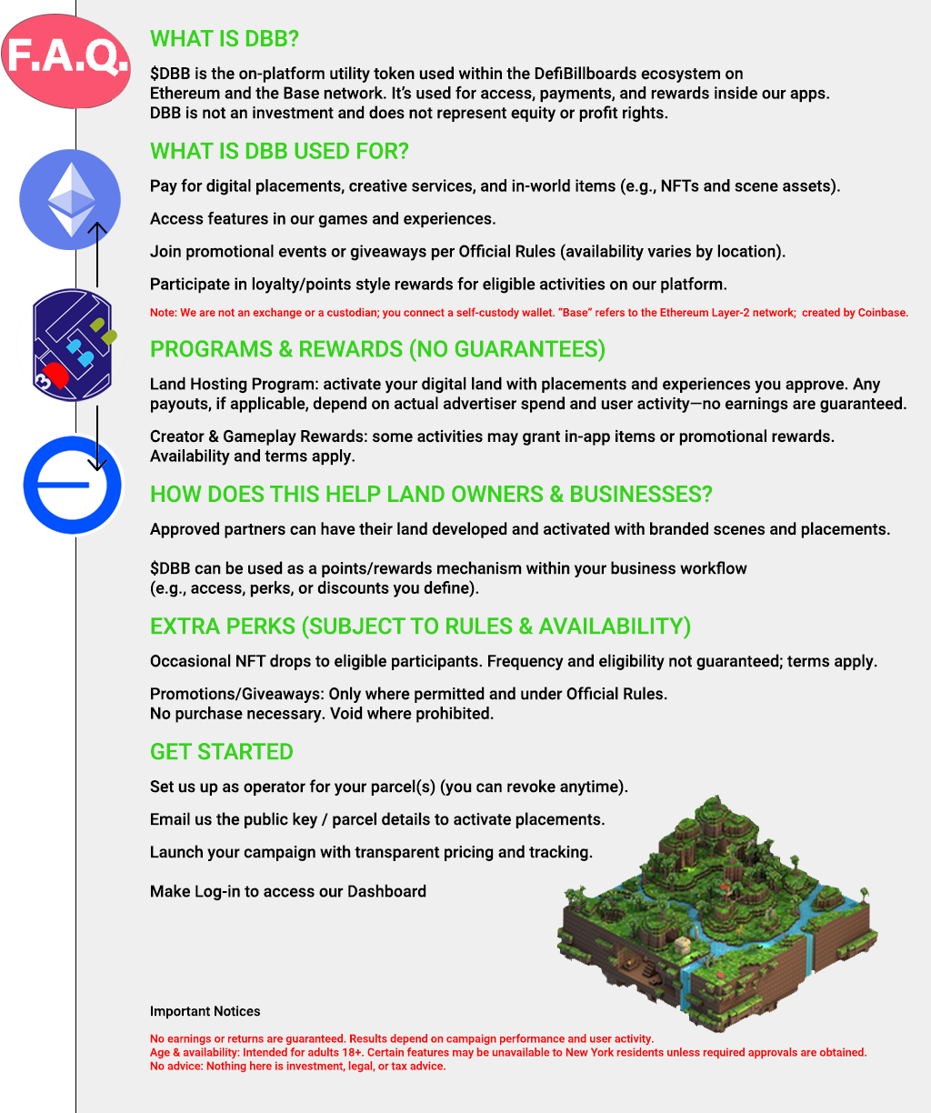 $DBB is an ERC-20 utility token that operates on Ethereum (and Base). That means it follows a widely used token standard and transacts on Ethereum’s public network. $DBB is used for on-platform access, payments, and rewards inside our ecosystem. Any price outside the platform—if available—depends on independent market activity and liquidity; no value is guaranteed. We do not offer investment advice. Security note: Our contracts follow standard ERC-20 patterns and undergo internal reviews. No system is risk-free; users should assess whether interacting with crypto is appropriate for them. DBB is not cash, not a deposit, and not equity or a claim on profits. Availability and features may be limited in certain jurisdictions (including NY). White Paper